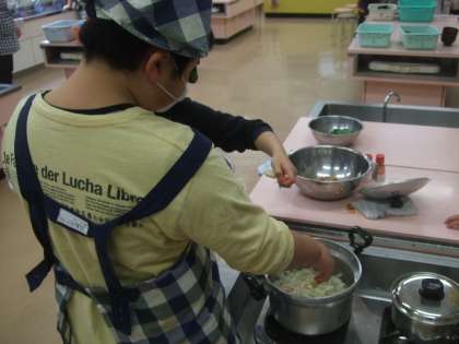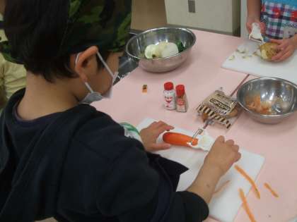 友達と分担して、ピーラーを使って野菜の皮をむいたり、包丁を使って切ったりしました。