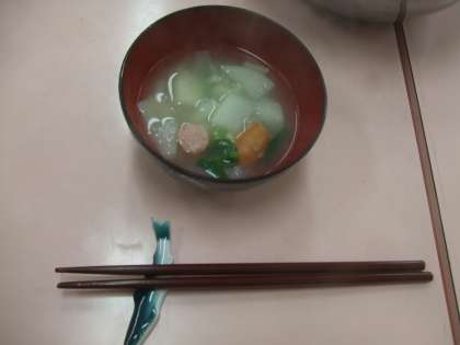 今日は調理学習でジャガイモ、ニンジン、タマネギ、ダイコン、小松菜、ウィンナーを使って『ポトフ』を作りました。