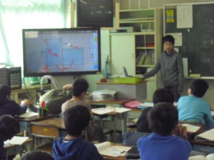 算数の時間には、小学校で習ったことの復習を進めています。今日は図形の面積の求め方について、タブレット型パソコンと電子黒板を使って考え方を確かめ合いながら取り組みました。