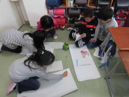 子どもたちは、商品を売る工夫やお店で働く人々の仕事について、友達と協力して新聞作りを進めていました。