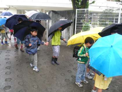大きい子は、小さい子と手をつなぎ、きちんと一緒に帰っています。