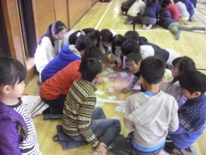今日の6年生を送る会で、3年生から6年生へ手作りのカルタがプレゼントされました。4校時にはそのカルタを早速使って、3年生対6年生のカルタ大会をしました。