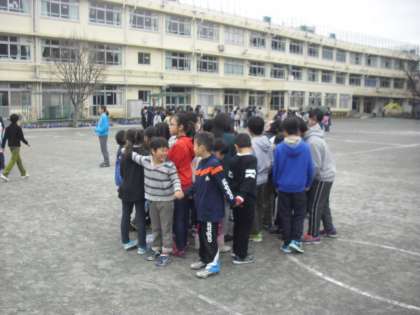 3/10 転入生の紹介、児童集会「人間知恵の輪ゲーム」の様子