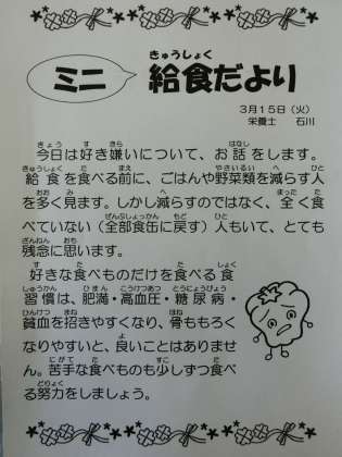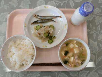 今日の給食のメニューは、「ご飯、さつま汁、焼きししゃも、きゅうりと大根の胡麻風味、牛乳」です。“ミニ給食だより”とともに調理・配膳室からワゴンで届けられ、教室で配膳し、子どもたちはいただいています。野菜たっぷりの“さつま汁”です。
