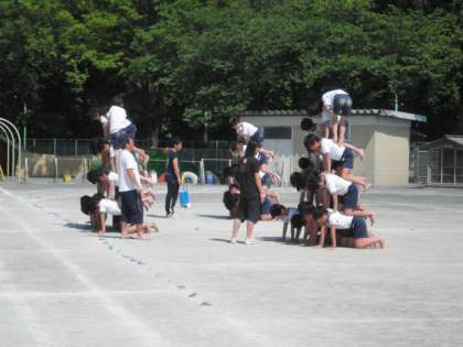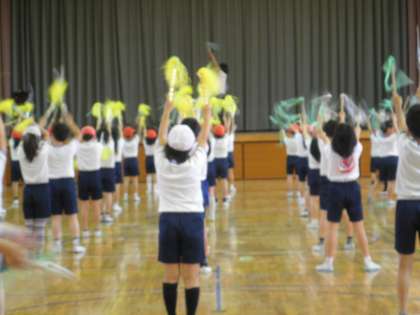 3年生は、竹の棒とスズランテープできれいな棒を使って練習をしています。