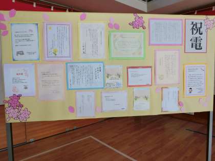 *写真(左)朝の正門 (中)卒業生自身が描いた自画像 (右)祝電・メッセージ