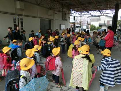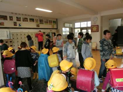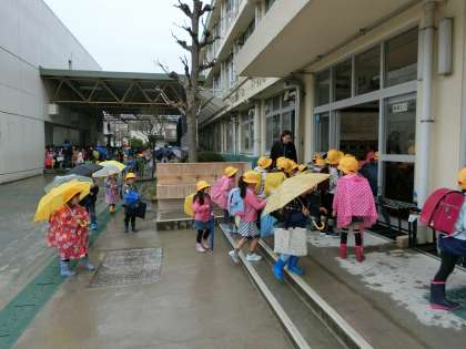 傘をさした1年生が、体育館前のピロティでチャイムが鳴るのをまっています。2年生や教員が対応し、傘の閉じ方や傘立てへの入れ方等を説明し、順序よく昇降口に向かいました。お世話役の6年生のお兄さんやお姉さんが優しく案内をし、教室へスムーズに移動することができました