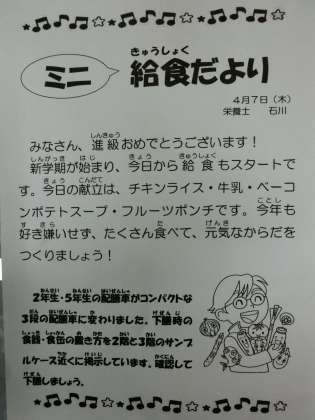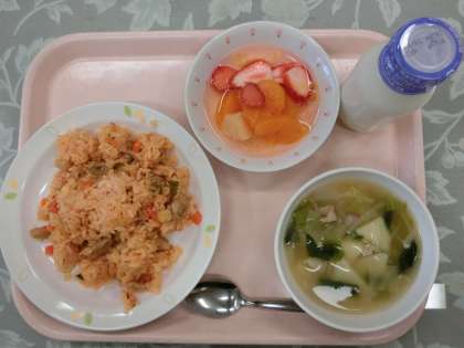 今日の献立は、「チキンライス、ベーコンポテトスープ、フルーツポンチ、牛乳」です。新しい教室での初めての給食。みんなで協力して準備をし、笑顔いっぱい、おいしそうに食事が進んでいました。
