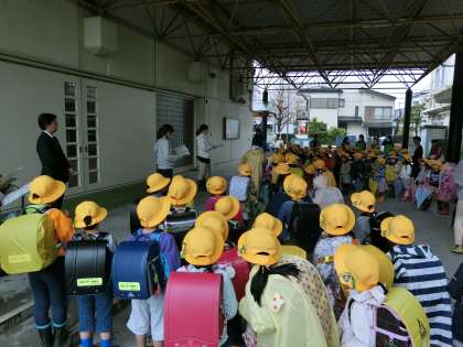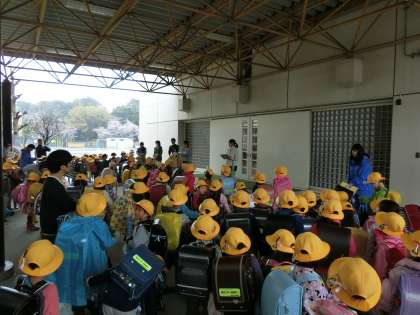 4校時まで学習を行い、帰りの支度をした1年生がピロティに集まりました。