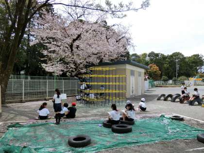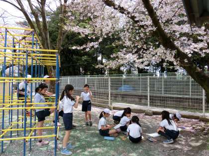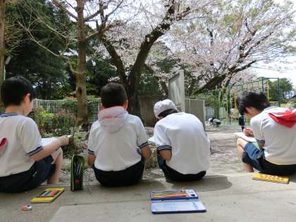 気持ちのよい天気の中、子どもたちは桜の花を楽しみながら観察カードを書いていました。