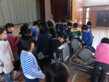 5年生として初めて学校のための仕事でしたが、よく考え自分から進んで動いていました。10分も経たないうちに、体育館にきれいにいすを並べることができました。
