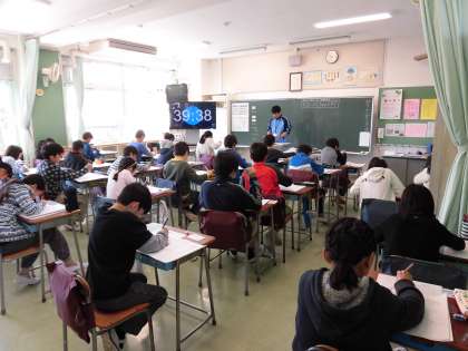 本日、1時間目から4時間目を使って、学習習得確認調査を実施しました。対象は5・6年生全員。調査教科は国語、算数、社会、理科の4教科です。前年度までの学習内容から出題されているとはいえ、どの子も真剣に問題に取り組みました。