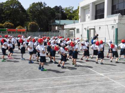 全員で準備運動をした後、スキップコースやジグザグコース、障害物のあるコースを走る運動遊びの学習と、短距離のタイム計測を行いました。