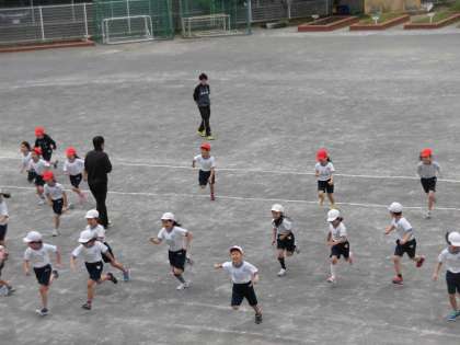 2、3組は体育で「前へならえ」や「回れ、右」などの動き方を学びました。さらに、鬼遊びをして校庭を元気に走り回りました。