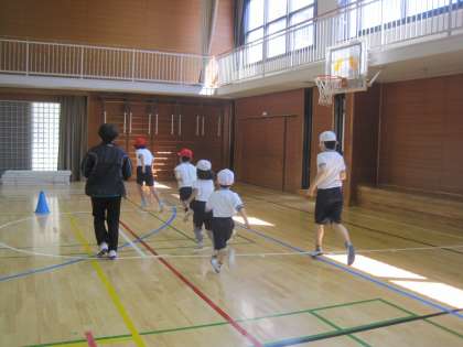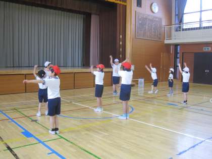 2時間目に体育館で体育をしました。始めに、体育係さんが、前に立って号令をかけながら、みんなでラジオ体操をしました。曲に合わせてしっかりと、体を動かしました。次に、先生のピアノに合わせて“歩く”“スキップする”“走る”の3つの動きをしました。どの子もうっすらと汗をかきながら、頑張って動いていました。最後に“かけっこ”の練習もしました。みんなで楽しみながら、気持ちよく体を動かすことができました。