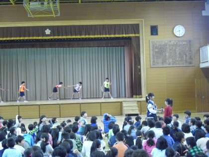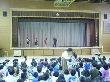 今朝は児童朝会で「間違い探しクイズ」をしました。集会委員会の子どもたちが舞台の幕の開閉を使って、様子が変わる前と後の様子を切り替えて出題しました。