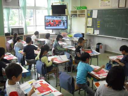 今日は2組、3組が図工の時間に、消防写生会の絵の色ぬりをしました。2年生になって初めて絵の具を使った学習だった今日、子どもたちは消防車や消防士の絵だけでなく、地面や空の色にも気を付けながら活動に取り組みました。