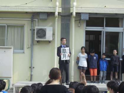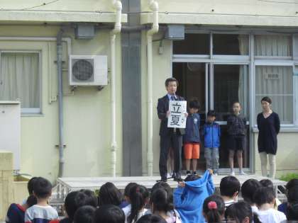 今朝は全校朝会を開きました。校長先生からは「皐月」、「八十八夜」、「立夏」のことばを交えながら、春から夏へ変わりゆく季節にかかわるお話がありました。