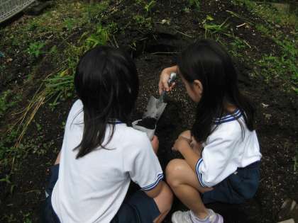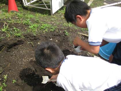 今日の理科の学習で、ヒマワリとホウセンカの種を蒔きました。前時には種の観察を行い、種の特徴を観察カードに記録しました。途中で雨が降ってきてしまったため、大急ぎで校舎に入りましたが、無事に種蒔きを終えることができました。教室の日当たりのよい場所に置いてあります。いつ芽が出るかな、と楽しみにしています。