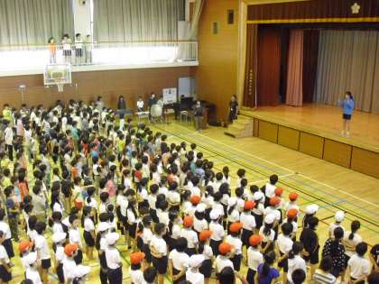 今朝は児童集会でした。運動会へ向けて、全校で校歌の練習をしました。