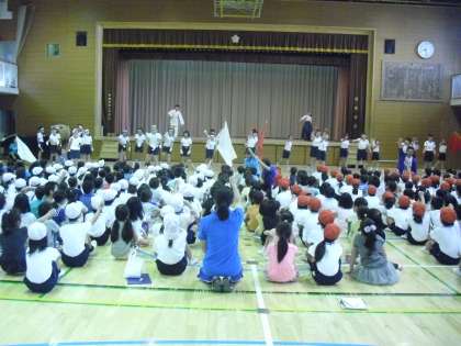 運動会の応援団が全校の前に立ち、赤、白それぞれの応援歌を歌いました。最後には赤、白に分かれた全校の子どもたちが応援団の指揮のもと、勝利への意気込みを感じさせる歌声で歌いました。