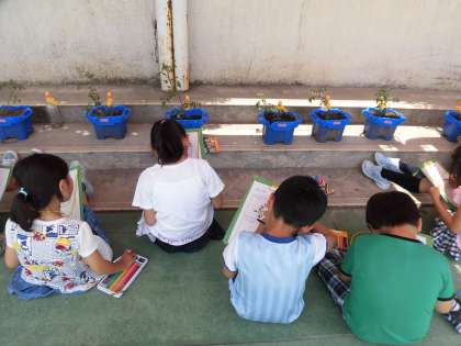 今日は1組の子どもたちが、ミニトマト、ナス、オクラ、ピーマンの観察をしました。葉の形や花の形をよく見ることをめあてにして、絵を描いたり気付いたことを文章にしたりして観察することができました。