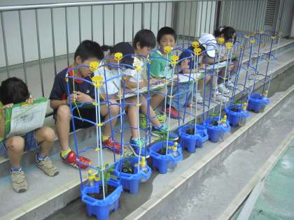 運動会前にミニトマト、ナス、ピーマン、オクラをそれぞれ育て始めた2年生。今日は2組が2回目の観察をしました。
