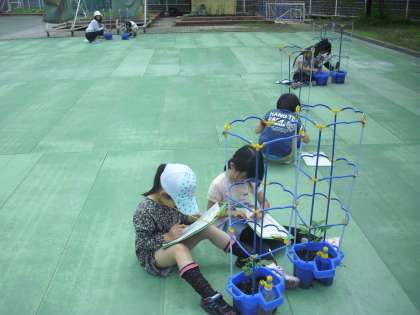 前回に比べ草たけや葉の様子が変わっていることに気付き、カードに書き記すことができました。中にはもう実ができているものもあり、「早く大きくなってほしい。」と、つぶやく子どもたち。野菜ができることへの期待はますますふくらんでいるようです。
