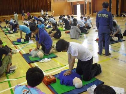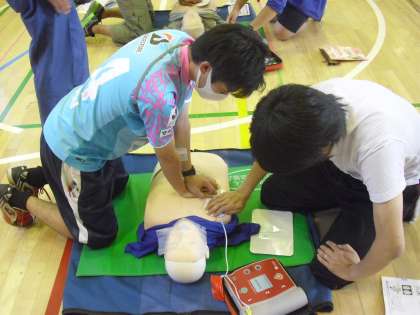 心肺停止の人を発見した際の人工呼吸やAEDの使用方法、気道確保の手順などを、演習を通して学びました。