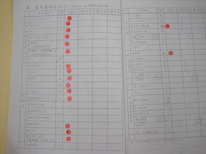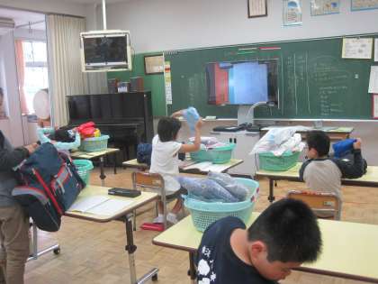 5時間目の生活単元学習の時間に、河口湖連合移動教室に向けて、事前学習をしました。今日は、大きなリュックサックを持ってきて、持ち物調べをしました。「リュックの中のものを全部かごに出してみましょう。」と担任が言葉をかけると、子どもたちは、自分で荷物を出し、ワークブックの持ち物調べのページを見ながら「タオルありまーす。」「パジャマありまーす。」と確認をしていきました。数がそろっているか、名前が記入されているか等も一つ一つ確認し、持ち物調べ表にシールを貼りました。出発当日に向けて、毎日少しずつ学習を進めています。