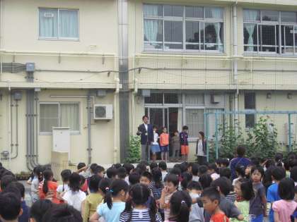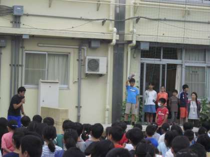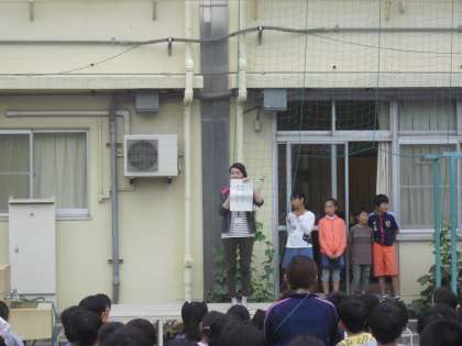 運動委員会の子どもたちと明官先生からは、今週から始まる「縄跳び旬間」について、縄の持ち方やなわとびカードの使い方についてのお話がありました。