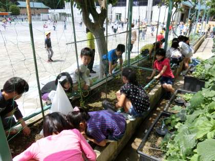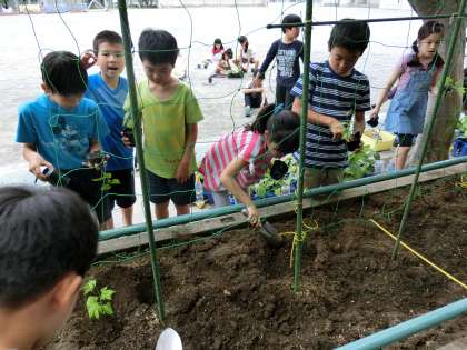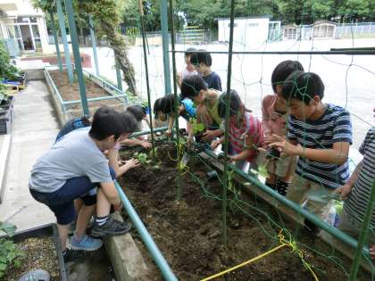 校舎にもグリーンカーテンがありますが、4年生のグリーンカーテンも立派に出来上がるように、お世話と観察を続けていきます。