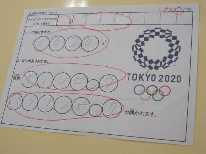 今日は土曜授業日でした。4時間目の生活単元学習で「オリンピック・パラリンピックについて知ろう」という学習をしました。始めに、1964年の東京オリンピックの聖火ランナーの映像を見て、気がついたことを発表し合いました。次に、担任から太陽の光を集めて聖火を作ること、シンボルマークの五輪マークは五大陸を表していることを聞き、驚いていました。オリンピックと同時にパラリンピックもあることも知り、スポーツの祭典であることを学びました。最後に2020年には再び東京でオリンピック・パラリンピックが開催されることをプリントに書いて、確認しました。