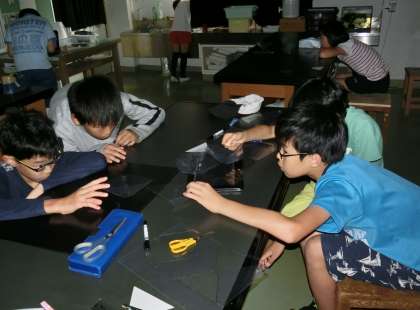 まず、透明なラミネート板を台形に切り抜き、4枚をピラミッド状に貼り合わせます。これをタブレット端末の上に置き、専用の動画を流すだけでピラミッドの中に映像が浮かび上がって見えるのです。
