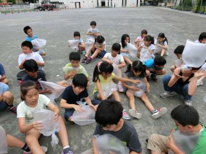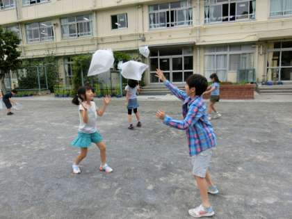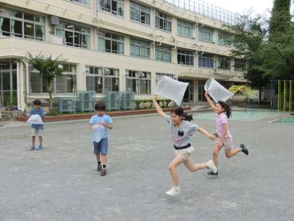本日から新しく始まった単元「空気と水」の学習では、空気をビニール袋に閉じ込める活動を行いました。校庭に出て、ビニール袋を振り回して空気を集めたり、ビニール袋をボールの様に友達とパスし合ったりして遊びました。それらの遊びから、「袋を押したら形が変わること」や「袋を押すと押し返される感触がある」こと等、気付いたことを友達と交流し、みんなで確かめていきました。
