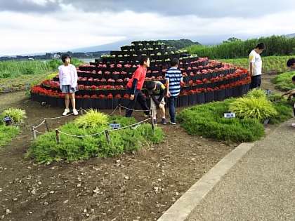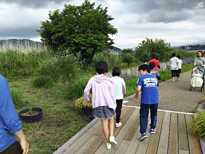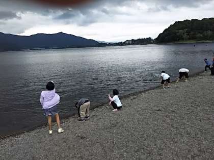 河口湖湖畔を散歩しています。美しい景色に、感動している子どもたちです。