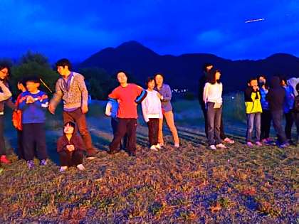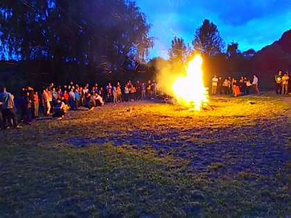 キャンプファイヤーが始まりました。火の神様から火を授かり、ファイヤーを囲んで、歌って踊ってとても盛り上がっています。
