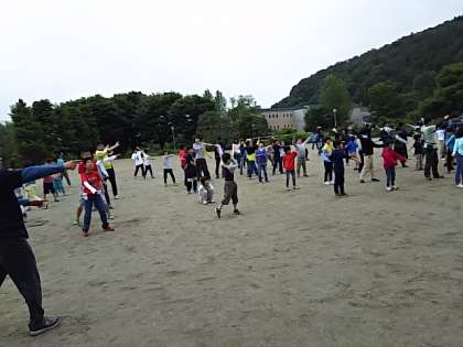 2日目がスタートです。園庭で朝会を行いました。全員元気よく体操をしました。食事係は朝食の準備をしています。
