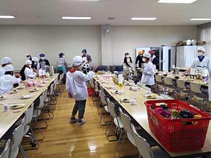 2日目がスタートです。園庭で朝会を行いました。全員元気よく体操をしました。食事係は朝食の準備をしています。