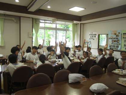 栄養士さんから、給食の残菜の話と、食器の並べ方についてお話をしてもらいました。