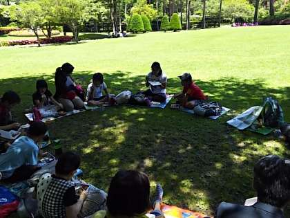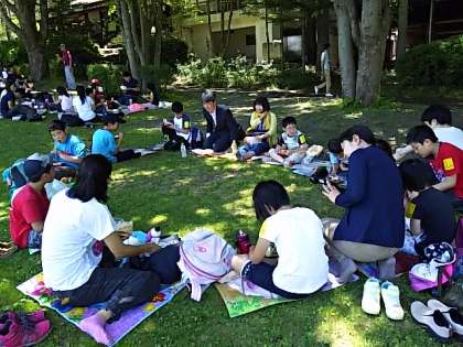 芝生の園庭で、みんなで輪になってお弁当を食べました。教育委員会の方々も加わり、子どもたちとの会話も盛り上がりました。