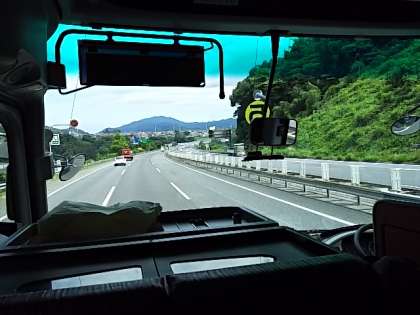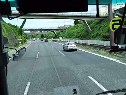 中央道談合坂サービスエリアで休憩を取りました。1時30分に出発し仙川駅を目指しています。車内ではビデオ映画が上映中で、子どもたちは楽しんでいます。