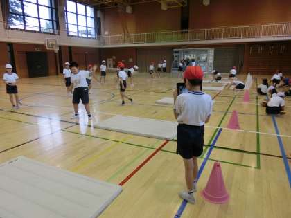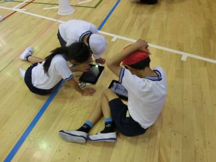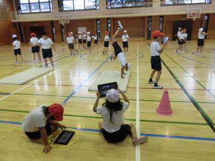 初回の学習では、3年生で練習した「開脚前転」や「開脚後転」、「側方倒立回転」等の技の復習をしました。タブレット型端末にインストールされたアプリケーションソフトを使って、各技のポイントやできない原因を確認したり、友達同士で動画を撮り合ったりして自分の動きを確認することに挑戦しました。初めて説明したアプリもあっという間に使いこなし、友達同士でアドバイスをし合うことができました。