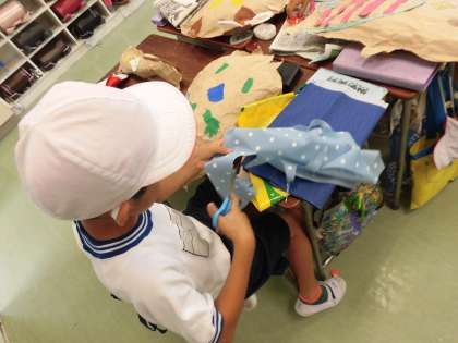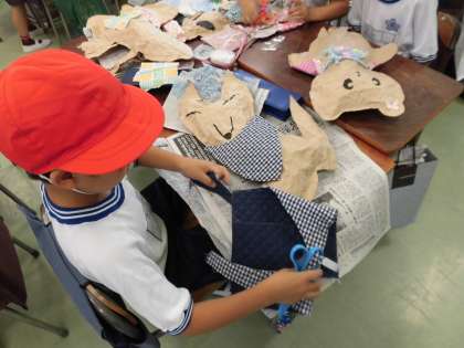 大きな紙を好きな生き物の形に切りぬいて、自分だけのマスコットを作りました。新聞紙をつめると、クッションのようにフワフワになり、子どもたちは大喜びでした。