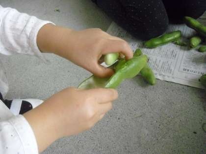 2年生は1校時に生活科でそらまめのさやむき体験をしました。
