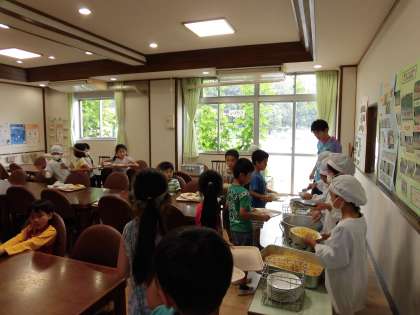また、2年3組はランチルーム給食でした。栄養士の石川先生のお話をしっかり聞き、食事の大切さを学習しながら、楽しく給食をいただきました。