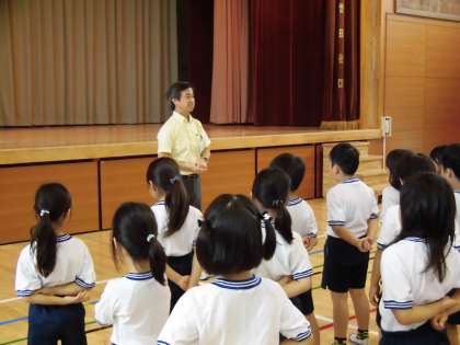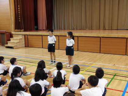 今日はあいにくの天気でプールに入ることはできませんでしたが、体育館でプール開きを行いました。校長先生の話を聞いて、めあてをもつこと、ルールを守ること、話をよく聞くこと、の大切な3つのことを確認しました。その後、代表児童がみんなの前で今年の目標を発表しました。堂々とした態度で立派でした。入水の仕方等も確認しました。来週はプールに入ることができるとよいな、と思います。