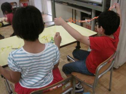 3・4時間目に図工の学習をしました。今日は、季節の飾りを作ろうということで、「七夕の飾り」を作りました。始めに「天の川」作りに挑戦しました。折り紙を縦に2回折ってから、はさみで交互に切り込みを入れました。そーっと広げるときれいな「天の川」のでき上がりです。切り込みを入れすぎると紙がつながらなくなってしまうので、定規でしるしを付けてから、慎重にはさみを使いました。星や提灯等も作って、笹の葉に見立てた針金の枝に飾り付けをしました。最後に、短冊に願い事を書いて吊し、自分だけの「マイ七夕飾り」の完成です。どの子も一生懸命に作ることができました。