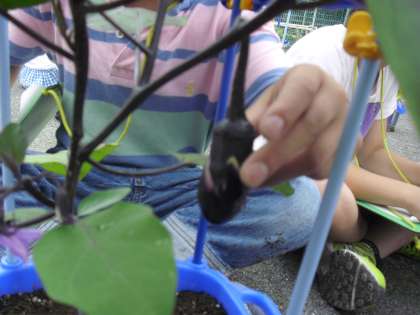 3、4校時の生活科では、野菜の観察をしました。育てているナス、オクラ、ピーマン、ミニトマトに実ができていました。自分が育てている苗に実ができた感動は格別のようで、「見て見て!こんなに大きいのができた!」と興奮気味に観察していました。
