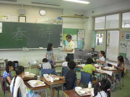 給食の時間には学級の子が校長先生から「読書通帳10000ページ突破」の表彰を受けました。